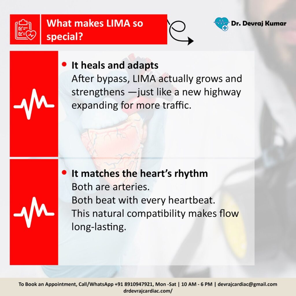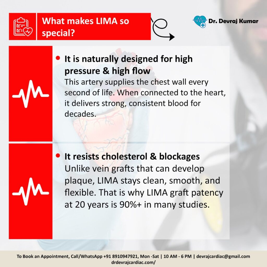 Magic of LIMA:Why Arterial Bypass Works for 20–30 Years.If there is one hero in bypass surgery, it is LIMA – the Left Internal Mammary Artery.Patients often ask:“Doctor, why do some bypass grafts last 20–30 years, while vein grafts fail earlier?”The answer is simple and magical: